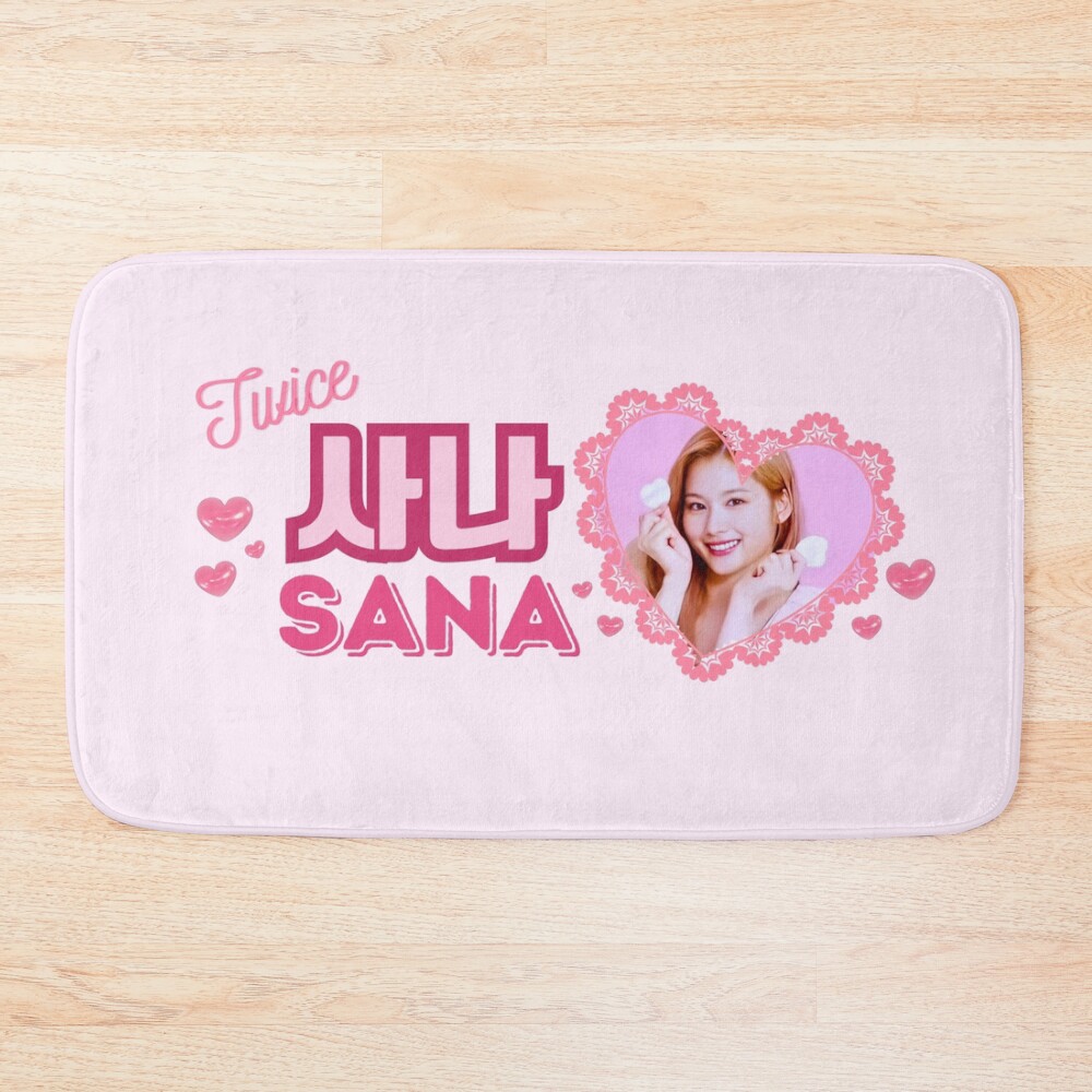 TWICE Sana Kpop Girl Group Pink Banner Collage Design With Member Names In Hangul Bath Mat